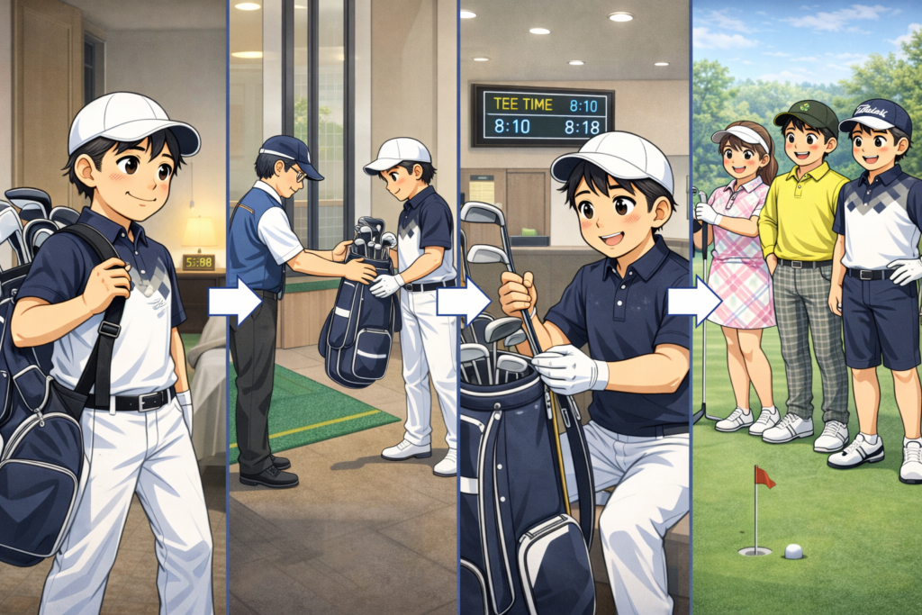 自宅出発〜ゴルフ場到着〜ラウンド開始までの“時系列チェックリスト”としてまとめました。